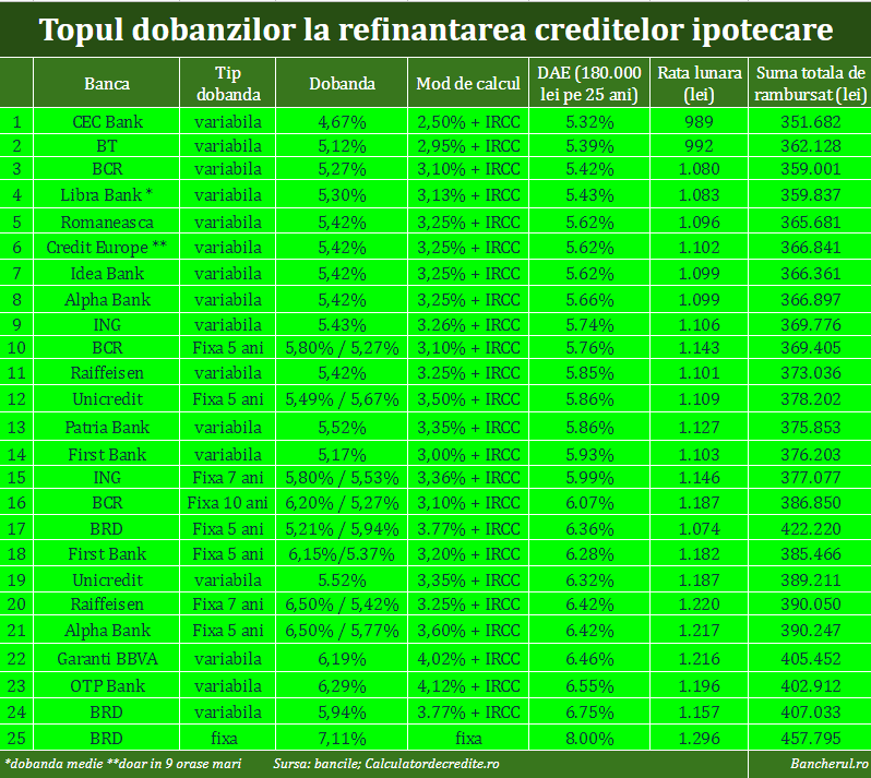 Printre bancile cu dobanzi mici la refinantarea creditelor ipotecare se mai gasesc Libra Bank (DAE medie de 5,43%) si Banca Romaneasca (DAE de 5,62%).
