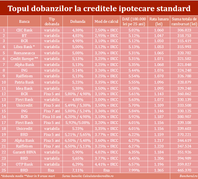 CEC Bank are cea mai mica marja de dobanda dintre toate bancile: 2,5% + IRCC, in total 4,38%, astfel ca DAE (indicatorul pentru costul total al unui imprumut, inclusiv comisioanele) pentru un credit in valoare de 180.000 de lei pe 25 de ani se ridica la 5,02%, rata lunara este 1.060 lei iar suma totala de rambursat ajunge, la 306.823 de lei la finalul creditului.