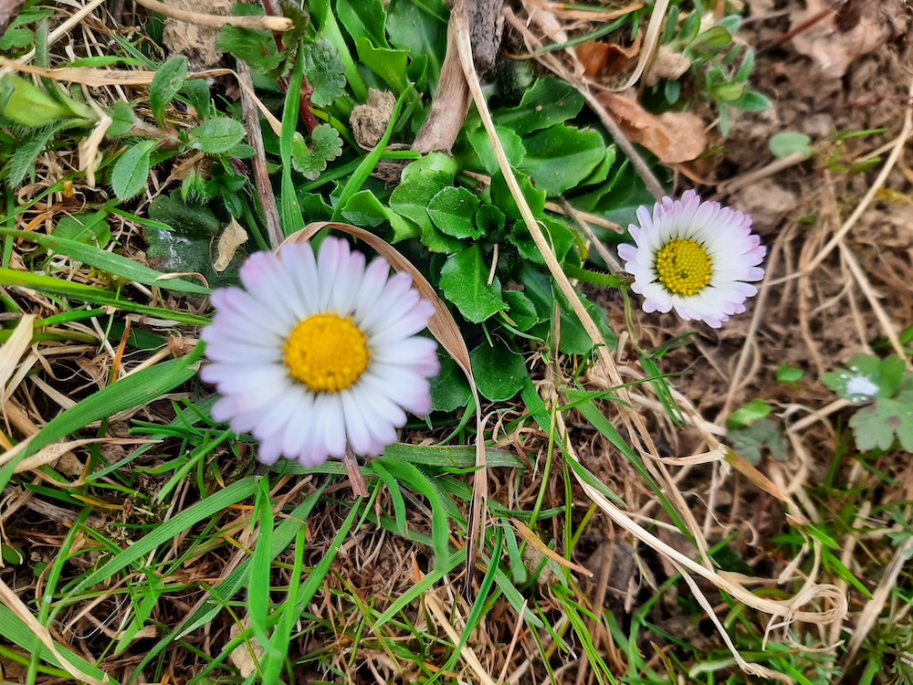 Bănuții sau părăluțele (Bellis perennis) sunt niște margarete în miniatură, cu broderie de un mov discret. Iese pe pășuni, odată cu iarba.